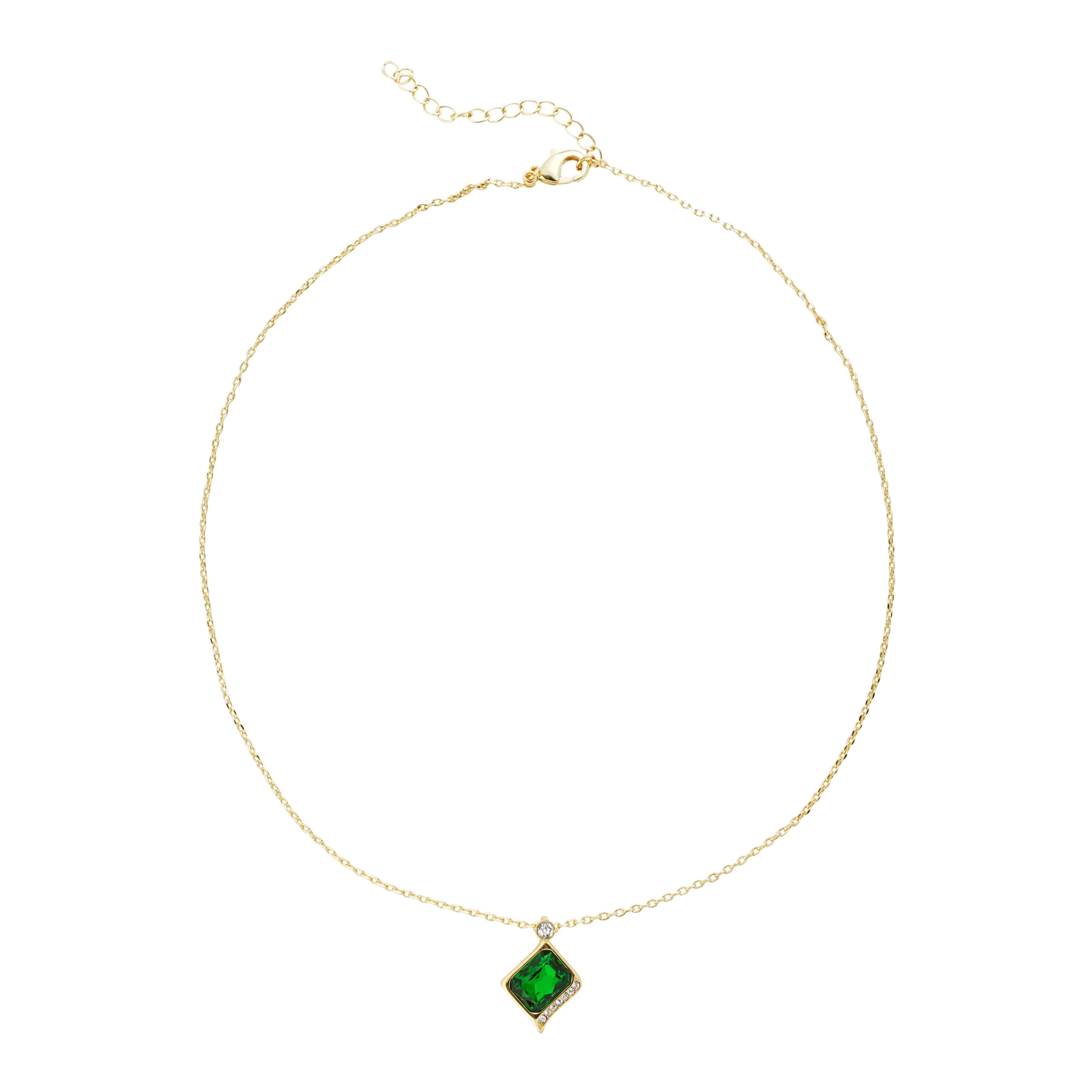 This stylish pendant necklace features an emerald-green baguette rhinestone set at a refined diagonal angle, creating a modern and eye-catching silhouette with a fine-jewelry look. The diagonal orientation adds movement and light-play, making the piece visually unique compared to classic vertical or horizontal baguette designs.