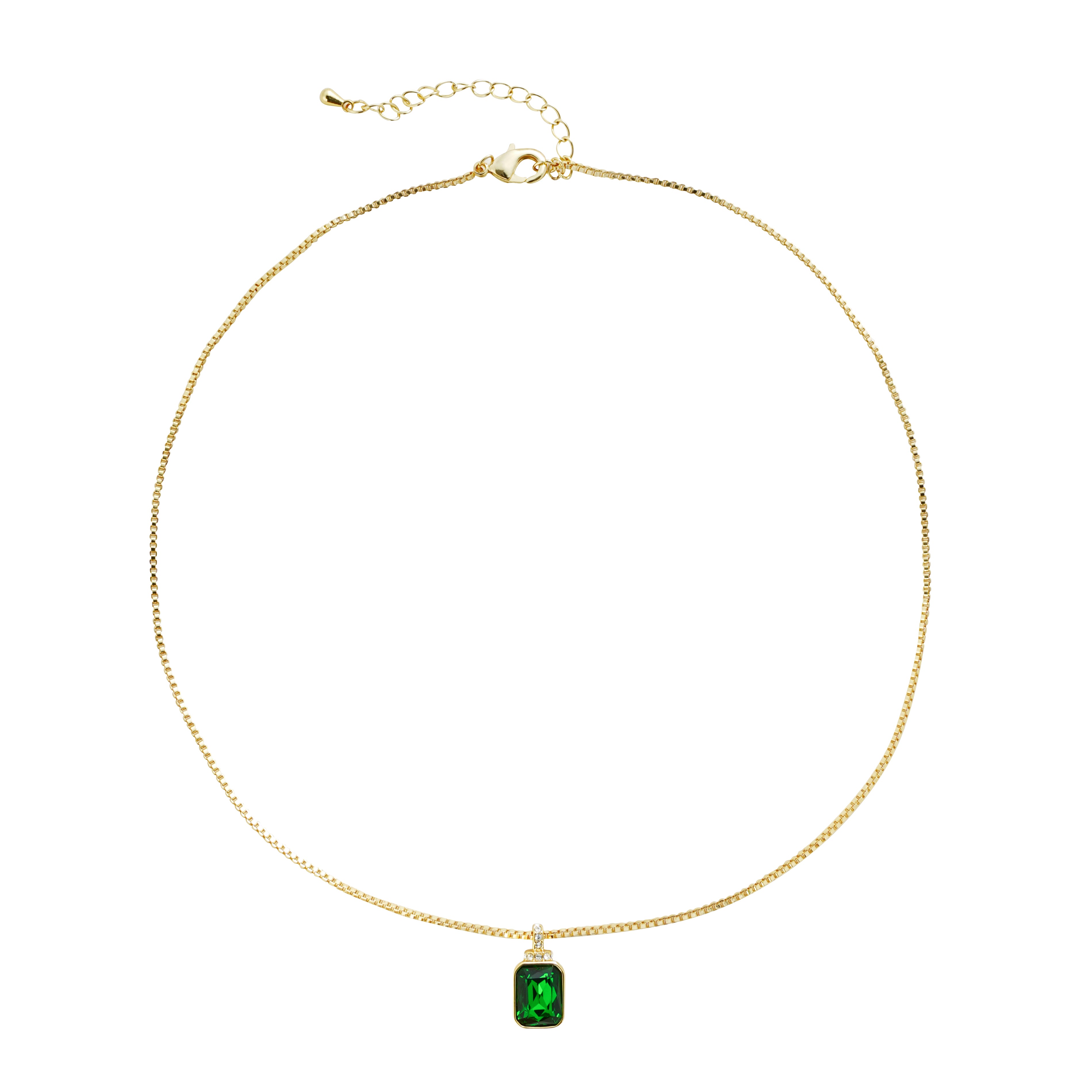 This refined pendant necklace showcases a striking emerald-green baguette-cut rhinestone at its center, small clear rhinestones for added brilliance. The slim and lightweight chain enhances the fine-jewelry aesthetic, while the high-quality imitation gold plating ensures a luxurious shine with long-lasting wear.