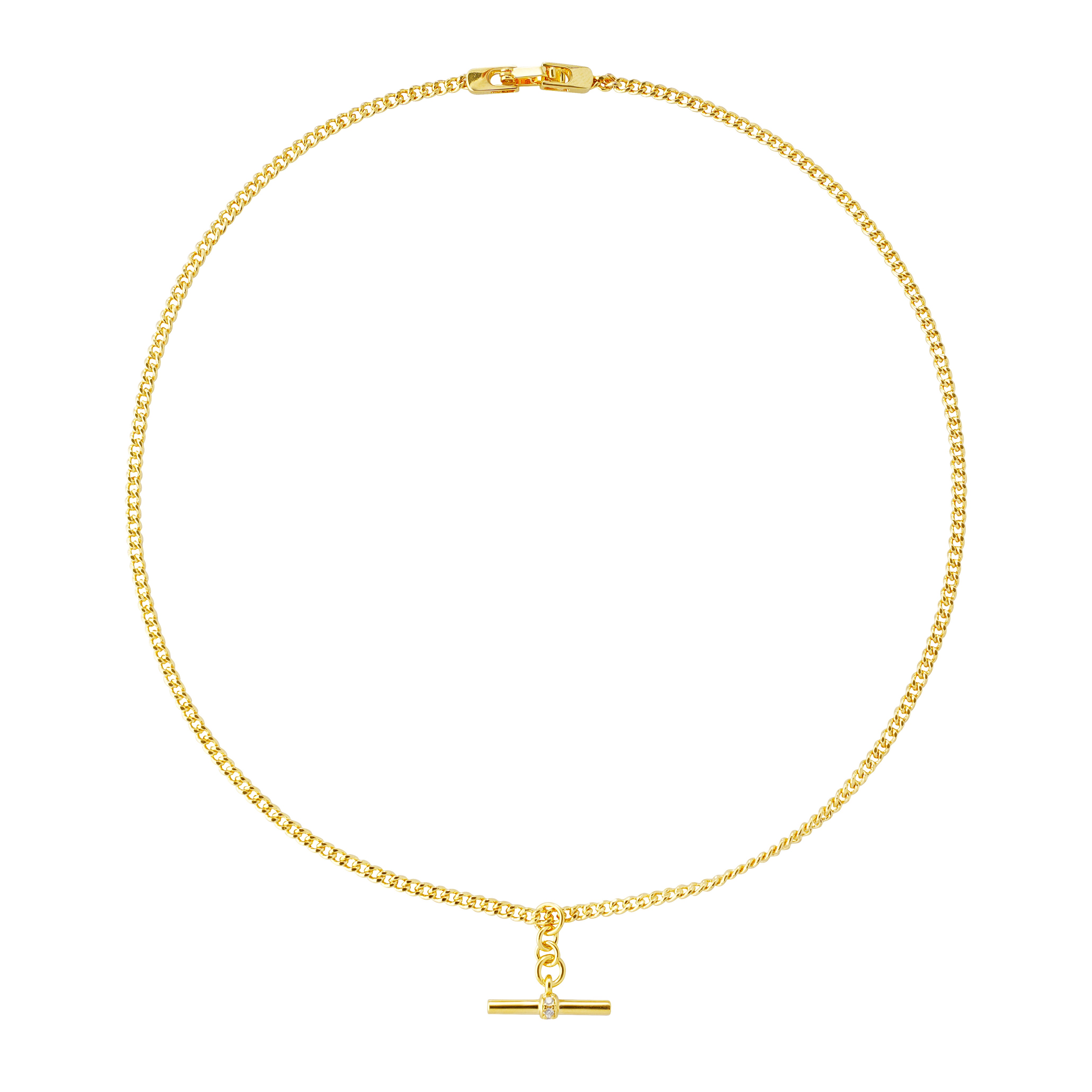 This necklace features a refined minimalist aesthetic, built around a sleek T-bar pendant suspended from a classic, tightly structured chain. Crafted in brass with premium 14K gold plating (20 mils), the piece delivers a bright, enduring shine suitable for both daily wear and elevated styling. A single 3A cubic zirconia set at the center of the T-bar adds a subtle touch of brilliance without overpowering the clean silhouette.