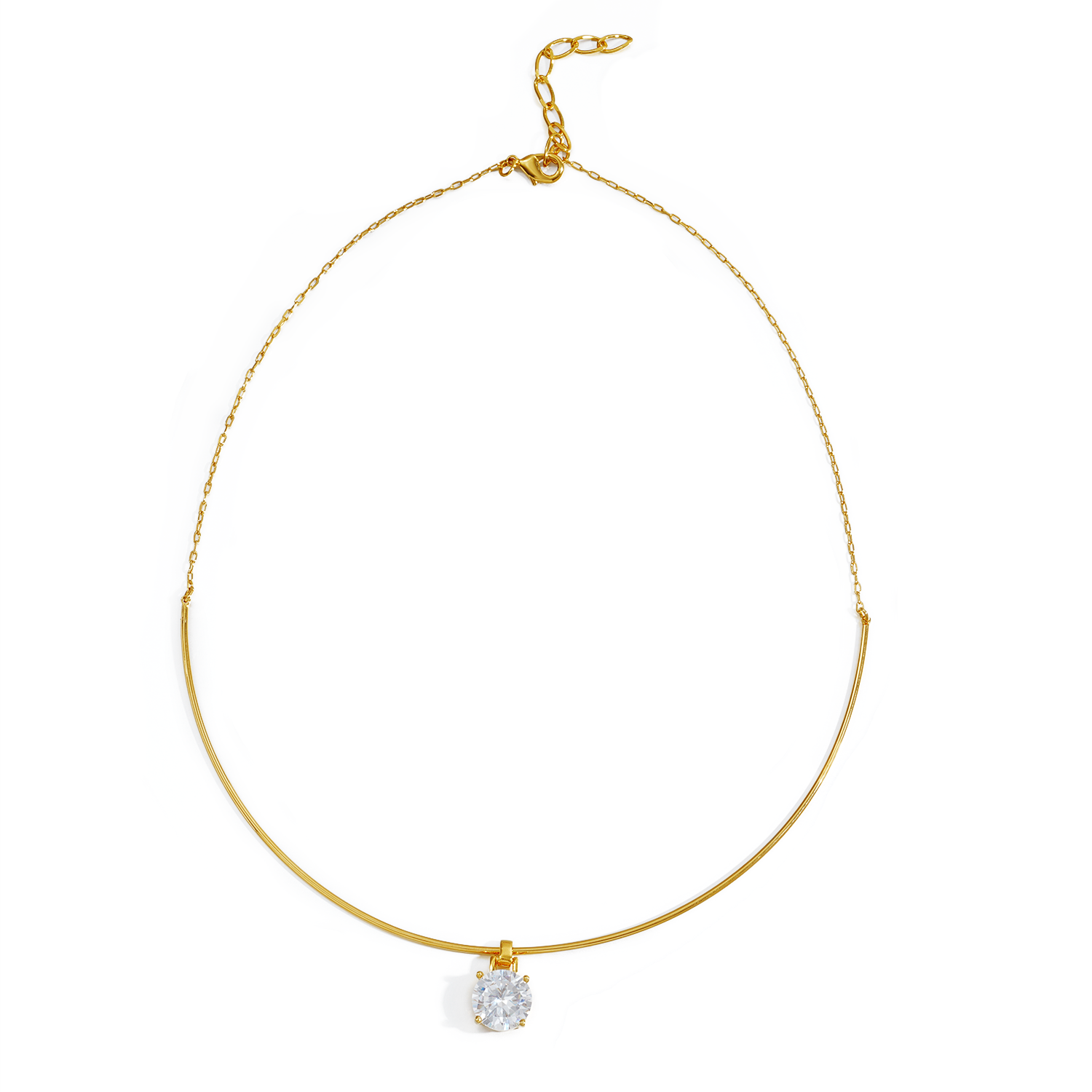 Crafted from high-quality brass and plated with real 14K gold, this sleek collar necklace features a brilliant 3A cubic zirconia pendant that glides smoothly along the curved front bar — adding a touch of movement and sparkle with every turn.