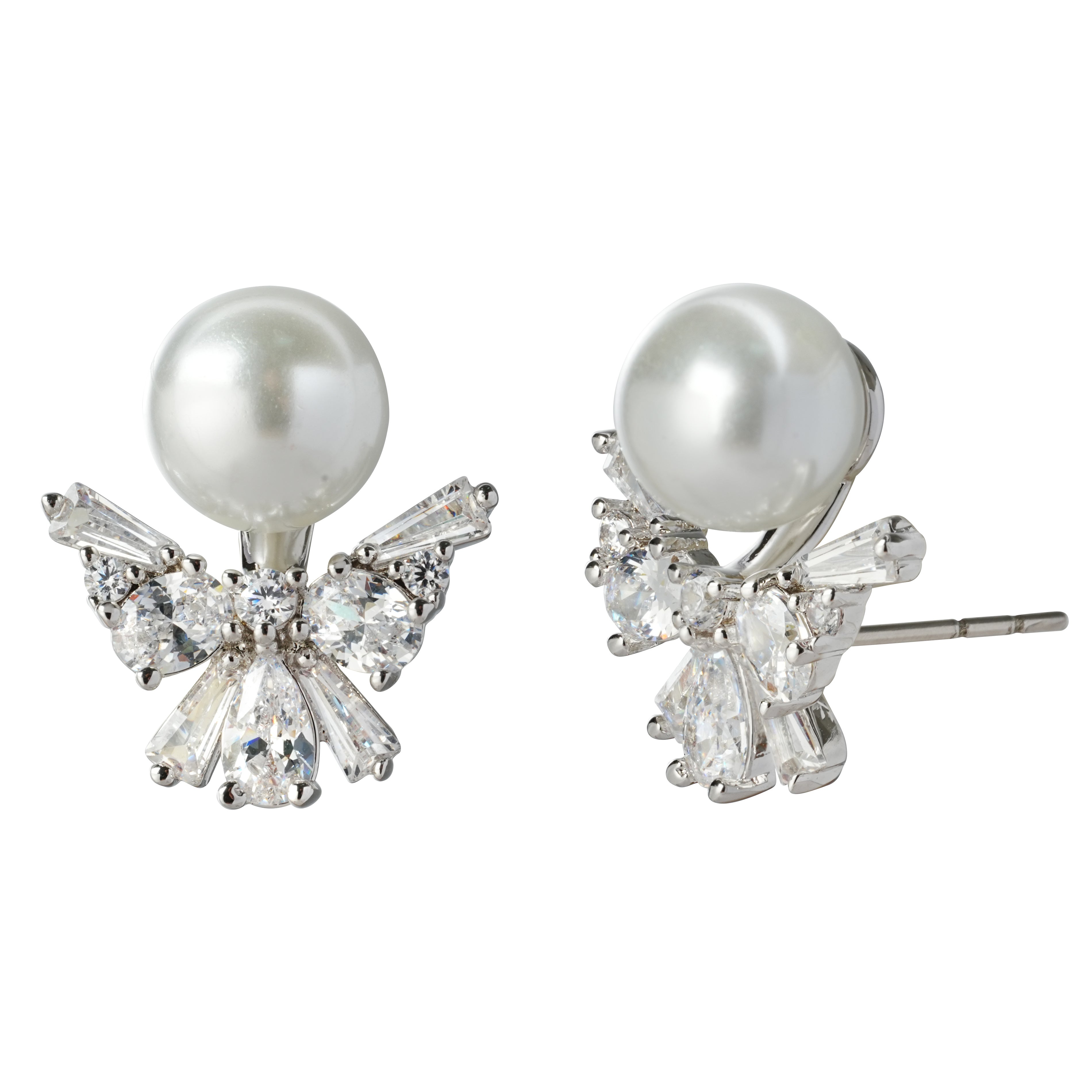 Crafted in copper with premium rhodium plating, the earrings feature enhanced brightness, improved tarnish resistance, and a clean white-metal finish favored in European and US markets. The design uses pear-shape, tapered baguette, and round CZ stones to create a sparkling wing motif beneath a smoothly polished glass pearl.