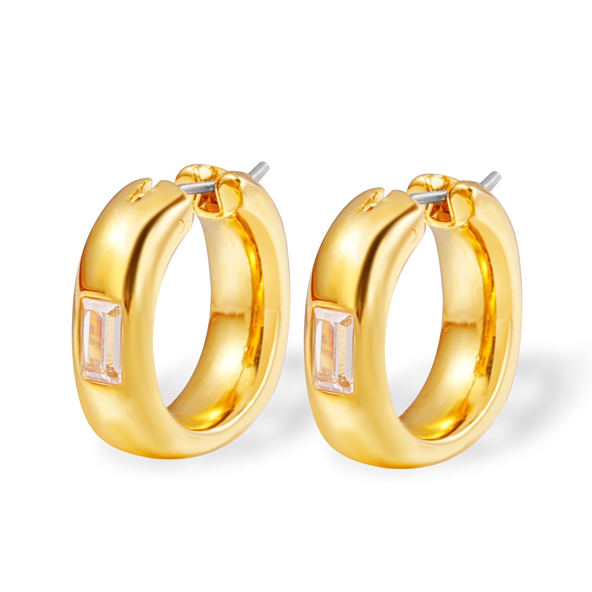 Add timeless elegance to your look with these gold huggie hoop earrings, designed with sleek curves and a touch of sparkle. Crafted from nickel free brass and plated with 14K gold, each hoop features a brilliant baguette-cut cubic zirconia stone, offering the perfect balance of sophistication and modern style.