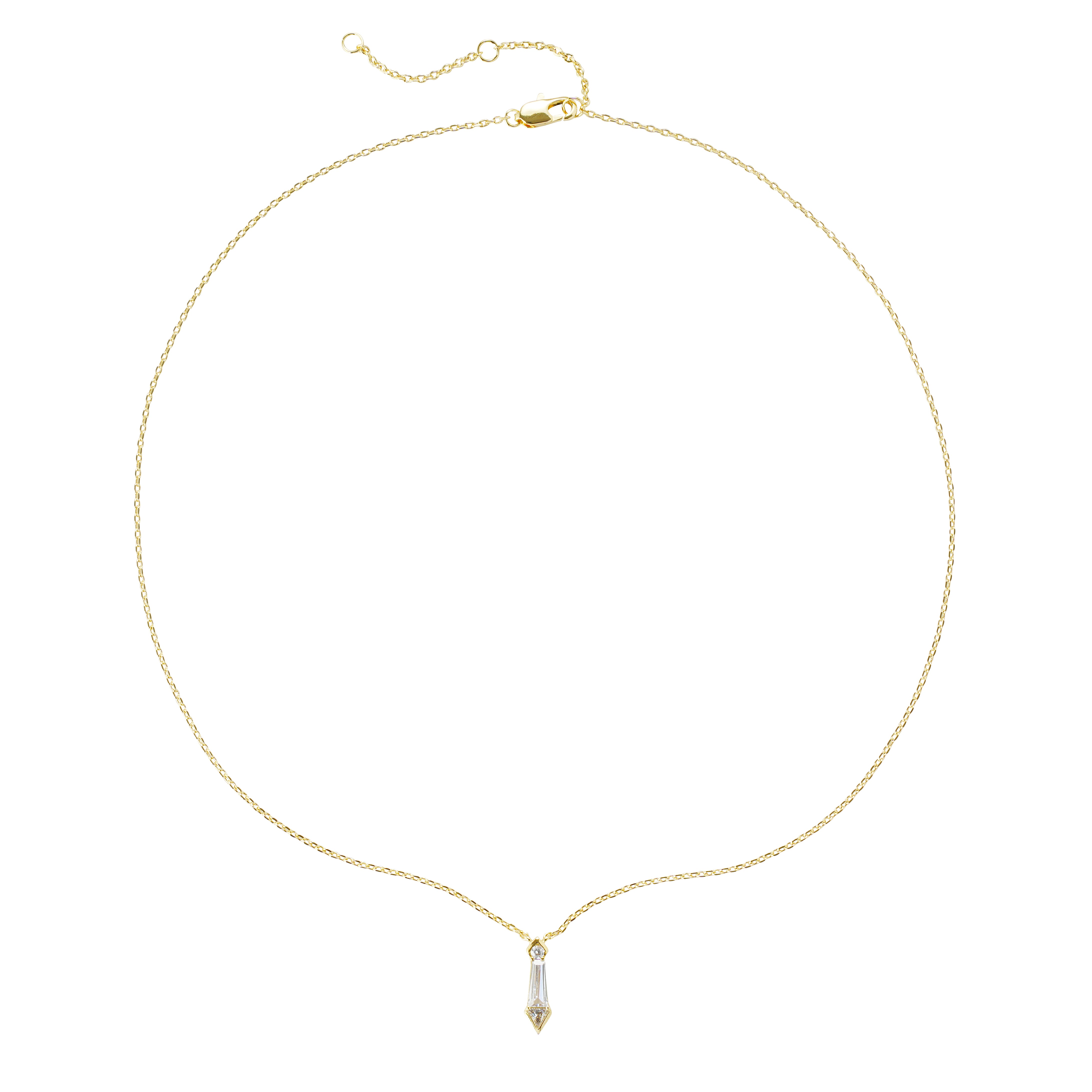 This refined necklace features a sleek tapered 3A cubic zirconia pendant set on a delicate copper chain plated with real 14K gold. The minimalist silhouette adds a subtle touch of sparkle, making it perfect for brands seeking elevated essentials with strong commercial appeal. Its lightweight construction and timeless form ensure high sell-through across both everyday and occasion-wear categories. Ideal for layering assortments, capsule collections, and modern classic product lines.