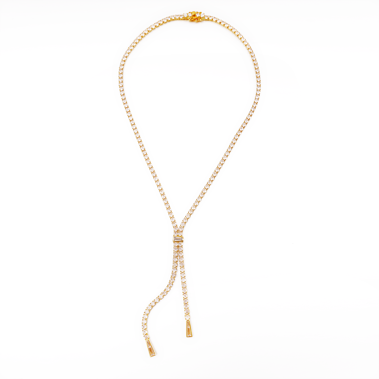 This stunning full zirconia tassel necklace features a graceful Y-shaped silhouette with two asymmetric tassels — one 85mm and the other 65mm — each adorned with a trapezoid-cut zirconia at the tip.