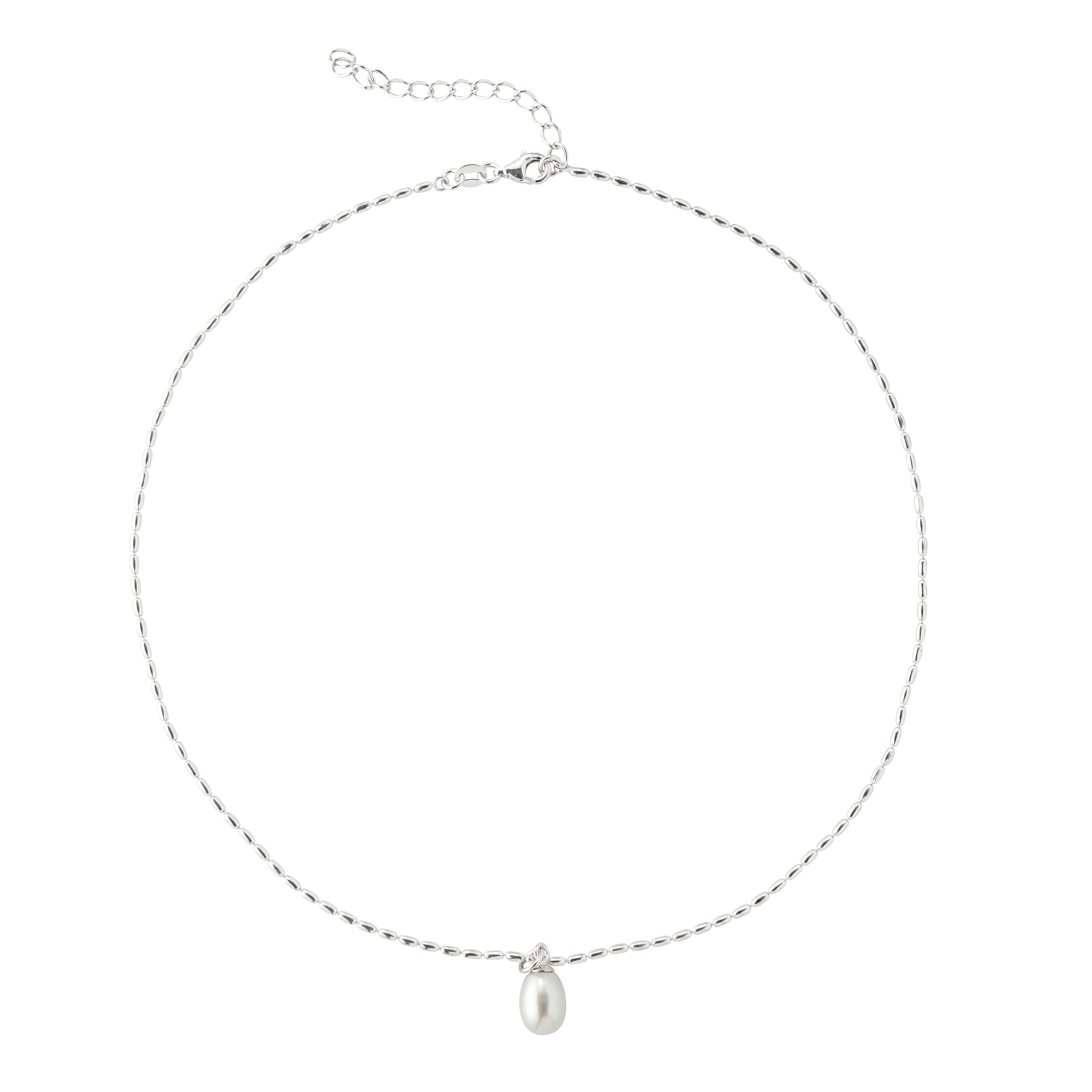 This elegant necklace features a refined rice-bead chain crafted from 925 sterling silver and plated with premium rhodium for a bright, tarnish-resistant finish. The chain’s subtle 2×4mm bead structure offers a sleek, modern texture that beautifully complements the natural luster of the 8×10mm oval freshwater pearl pendant.